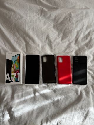 Teléfono móvil Samsung Galaxy A71 con 128GB de almacenamiento. Incluye varias fundas protectoras. - Capacidad de 128GB. - Variedad de fundas incluidas.