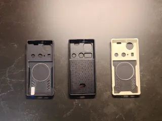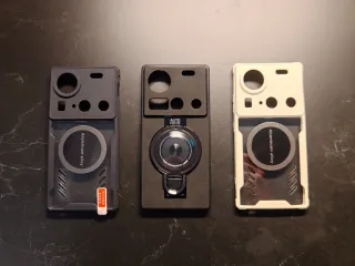Conjunto de tres fundas para teléfono móvil. - Una funda transparente. - Una funda de color gris oscuro. - Una funda de color negro.