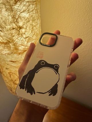 Funda para iPhone 13 con un diseño de rana japonesa negra con fondo blanco hueso. - Estampado de rana en color negro. - Transparente con detalles en negro. - Muy rígida. Modelo Impact Air. - Sin usar.