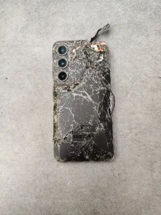 Teléfono móvil Samsung Galaxy S23 en color negro. Presenta daños visibles en la pantalla y carcasa. El Telofono es para piezas - Pantalla agrietada. - Cámara trasera triple. - Logo de Samsung visible.