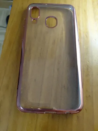 Funda protectora para Samsung Galaxy A20E. - Diseño transparente con borde rosa metálico. - Recortes precisos para cámara y botones.