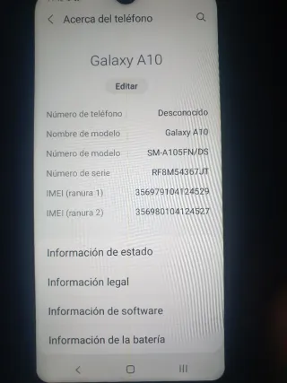 Teléfono móvil Samsung Galaxy A10. - Modelo: SM-A105F/DS - IMEI (ranura 1): 357872105784871 - IMEI (ranura 2): 357873105784879