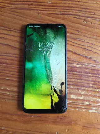Samsung Galaxy A10. El cristal de la pantalla no está roto pero no funciona bien, le salen rayas de vez en cuando, tiende a ponerse un poco blanca y el táctil en el borde derecho falla. Aun así se puede utilizar. Comprobado llamadas, puerto de carga, altavoz, micro, jack de auriculares, WiFi, cámaras, batería, todo perfecto. No tiene bloqueo ni cuentas. Sin caja ni cargador. Para piezas. Sin devolución. No regateos.