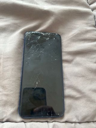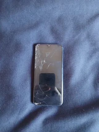 Teléfono móvil Samsung Galaxy A20e en color azul. La pantalla presenta grietas visibles, pero funciona bien. La batería va perfectamente bien INCLUYE FUNDA DE COLOR NEGRO