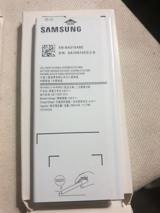 Vendo batería nueva Samsung EB-BA510ABE para Samsung Galaxy A5 (2016). Está en su embalaje original nueva Envio o badalona gorg l2 - Modelo: EB-BA510ABE - Capacidad: 2900 mAh - S/N: AA1H610SS/2-B - Fabricada en China, ensamblada en Corea.