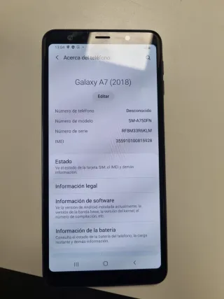 Teléfono móvil Samsung Galaxy A7. - Modelo: SM-A750FN - Detalles de software y batería.