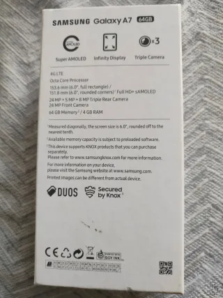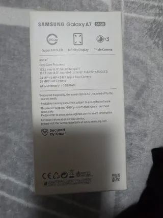 Samsung Galaxy a7 -Ram 4gb -64 GB almacenamiento -Pantalla 6.00 -Bateria 3300 mah -Cámara triple 24mp+8mp+5mp -Parte trasera nueva -Pantalla nueva aún con plastico.