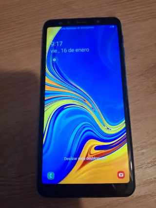 Teléfono móvil Samsung Galaxy A7 en color azul. - Pantalla con diseño vibrante. - Botón de llamada de emergencia accesible. - Opción de deslizar para desbloquear.