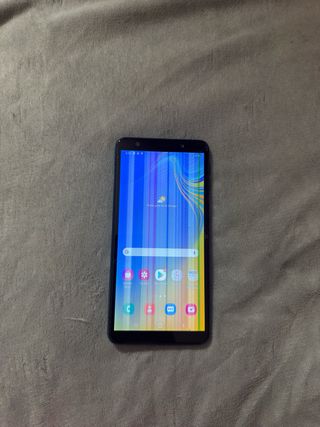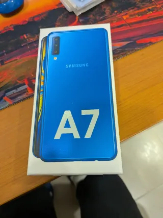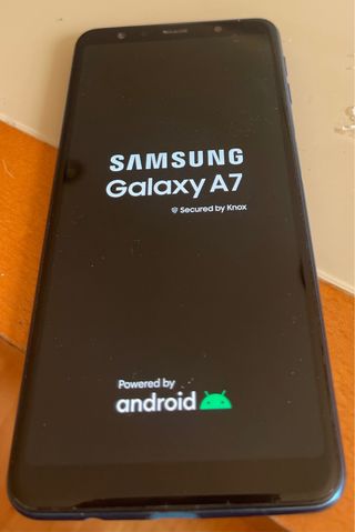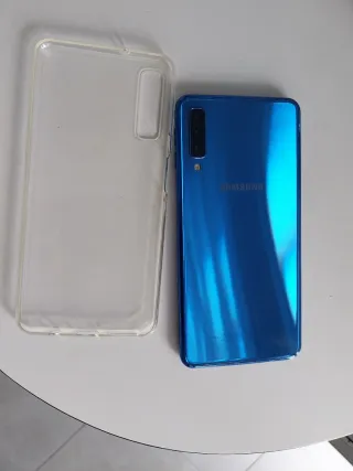 Teléfono móvil Samsung Galaxy A7 en color Azul, con alguna marca tipica del uso, en buen estado. Incluye cargador y cable. - Pantalla de 6 pulgadas. - Cámara trasera triple. - Batería de larga duración. - 4gb Ram/ 64gb Rom.