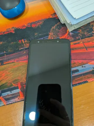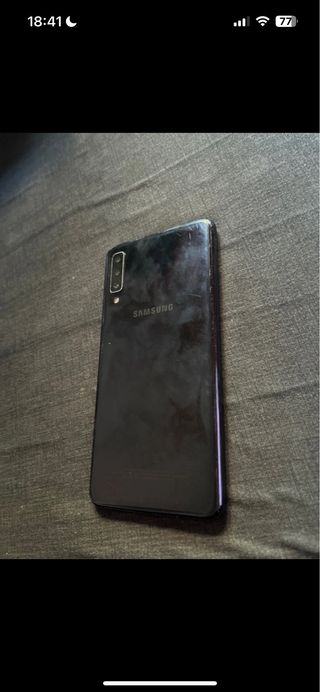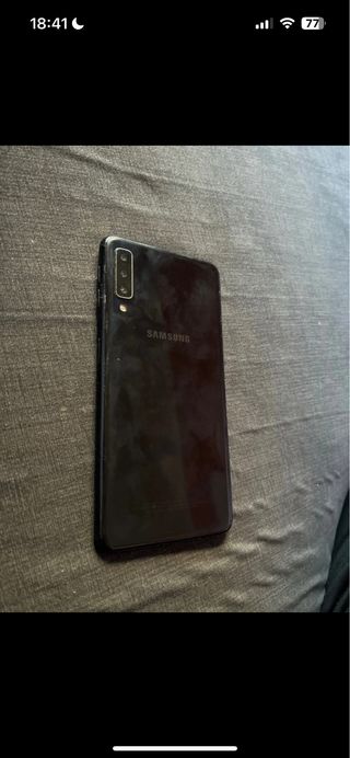 Teléfono móvil Samsung Galaxy A7 en color negro. Parte de atrás con golpe. Funciona perfectamente. - Pantalla de 6 pulgadas. - Cámara triple trasera. - Batería de larga duración.