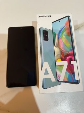 Teléfono móvil Samsung Galaxy A71 128GB en color azul. Incluyo la caja original. Se ha usado siempre con funda y no ha tenido ningún golpe, ha estado muy cuidado.