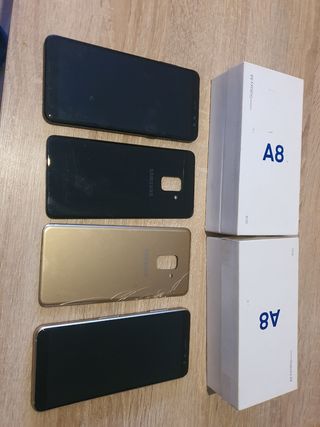 2 samsung galaxy a8 2018 de 32 gb Ambos necesitan bateria El que tiene el cristal trasero roto se reiniciaba en el logo no se porqué, el otro está completamente desbloqueado. Ambas pantallas funcionan correctamente y sin ningún problema