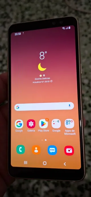 Samsung Galaxy A8 (2018): Pantalla: Super AMOLED de 5,6″, FHD+ (2220×1080), 18,5:9. Procesador: Exynos 7885 Octa-Core + 4 GB RAM. Almacenamiento: 32/64 GB, ampliable hasta 256 GB con microSD. Cámaras: Trasera 16 MP; frontal doble 16 MP + 8 MP. Batería: 3.000 mAh, carga rápida, USB‑C. Conectividad: 4G LTE, Wi-Fi AC, Bluetooth 5.0, NFC, GPS. Extras: IP68 (agua/polvo), sensor de huellas frontal, Android 7.1.1, Samsung Pay, Bixby. Parte frontal sin golpes ni rozaduras. Parte trasera pequeño roce de la pintura debido al uso. Funciona perfectamente.