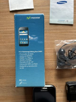 Caja original y el cargador para el Samsung Galaxy Ace 2. - Caja con diseño de Movistar. - Guía de inicio rápido. - Guía de configuración para Internet.