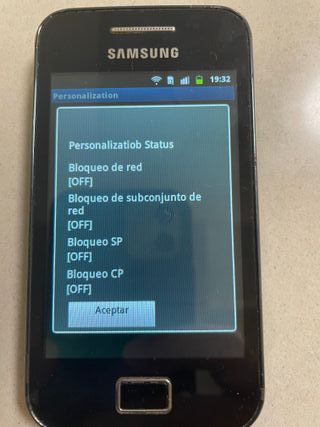 Teléfono móvil Samsung Galaxy Ace en color negro. Sin cargador, pero va con USB a USB micro. Al mirar en menú oculto pone desbloqueado (ver foto). Se conecta perfectamente a wifi (ver foto). Con auriculares.