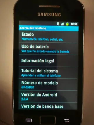 Samsung Galaxy Ace (GT-S5830) Vendo este clásico Samsung Galaxy Ace en buen estado. Tiene una pantalla TFT de 3,5″ (320×480), con Android 2.3 (Gingerbread) Funciona con un procesador de 800 MHZ, 384 MB de RAM y almacenamiento ampliable con microSD hasta 32 GB Cámara trasera de 5 MP con flash LED Batería de 1350 mAh extraíble