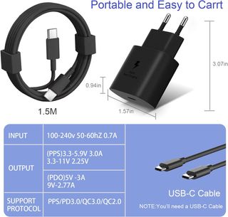 Producto nuevo a estrenar. Cargador USB C de 25W pensado para quienes quieren velocidad y seguridad desde el primer uso. Gracias a Power Delivery 3.0 alcanza hasta 25 W y carga del 0 al 55% en solo 30 minutos, ahorrando hasta 1,8 horas frente a cargadores de 5W. Incluye cable USB C a C de 1,5 m con cobre de alta calidad, baja resistencia y transferencia de datos de hasta 480 Mbps. Compatible con Galaxy S23, S22, Note 20, Z Fold y A series. Compacto, potente y muy fácil de usar. Diseño compacto ideal para viajes, oficina o coche, con protección contra sobrecarga y calor para cuidar tu batería 2316-B1