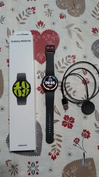 Reloj inteligente Samsung Galaxy Watch 6 en color negro. Incluye su cargador. - Correa de silicona. - Pantalla circular. - Incluye cable de carga USB.