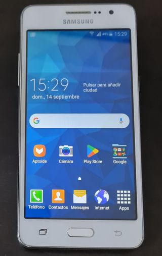 Teléfono móvil Samsung Grand Prime en color blanco. - Pantalla de 5 pulgadas. - Cámara trasera de 8 MP y frontal de 5 MP. - Procesador Quad-core 1.2 GHz. - Batería de 2600 mAh. - Almacenamiento de 8 Gb *NOTA IMPORTANTE* El teléfono va bien pero va algo relentizado debido a que ya tiene un tiempo, puede dar problemas en instalación de aplicaciones debido a la versión de Android que algunas aplicaciones necesite una versión superior. Básicamente es para darle un uso básico o para piezas. Para más información podéis buscar en Google, muchas gracias.