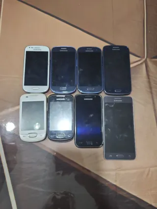 Conjunto de ocho teléfonos móviles Samsung para colección o incluso para usarlo funcionan todos. PRECIO POR SEPARADO 10€ El lote contiene: 3 Galaxy S3 Mini 2 Galasy mini GT-S5570 1 Galaxy Core 1 Galaxy Grand Prime 1 Galasy S Plus