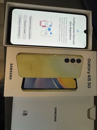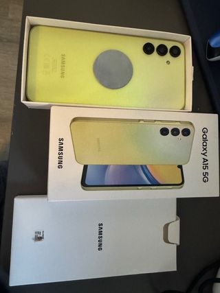 Teléfono móvil Samsung Galaxy A15 5G en color amarillo. - Pantalla grande. - Cámara versátil. - Conectividad 5G. Nunca se ha usado este teléfono solamente lo abrimos y encendimos para ver que funcionaba