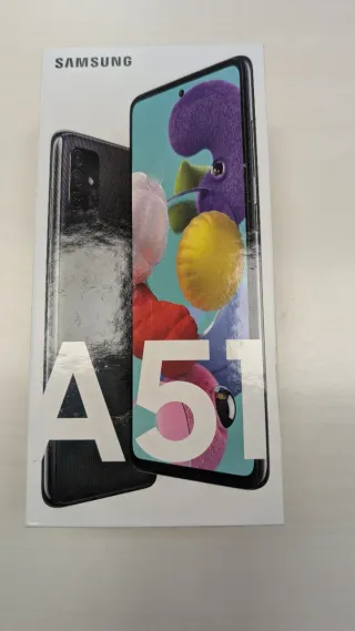 Caja original para el Samsung Galaxy A51. - Diseño frontal con imagen del teléfono y pantalla. - Logo de Samsung en la parte superior. - Inscripción A51 en grande.