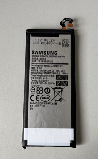 Batería Samsung Galaxy J7 2017 GH43-04688B Modelo: EB-BA720ABE Capacidad: 3600 mAh / 13.86 Wh Voltaje nominal: 3.85 V Voltaje de carga: 4.4 V SI NECESITA OTRA PIEZA U OTRO MODELO CONSULTE PRECIO Y DISPONIBILIDAD. Tenemos una gran variedad de stock de varios modelos. SKU: 729(H-1-4)