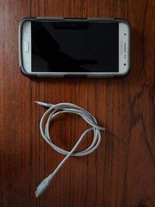 Teléfono móvil Samsung Galaxy J7 en color blanco, modelo de 2017. Se encuentra en buen estado. Carga para todo el dia. - Pantalla de 5.5 pulgadas. - Procesador Octa-core. - Cámara trasera de 13 MP y frontal de 5 MP. - Batería de 3300 mAh. - Incluye cable de carga. - Incluye la cubierta