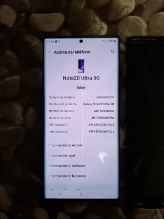 Teléfono móvil Samsung Galaxy Note20 Ultra 5G. - Modelo SM-N986B/DS. - Número de serie R5CR71S3RLK. - IMEI (ranura 1): 354626227245838. - IMEI (ranura 2): 359453167245834. Tiene una pequeña manchita en el lado izquierdo pero no perjudica en nada Sin caja ni cargador