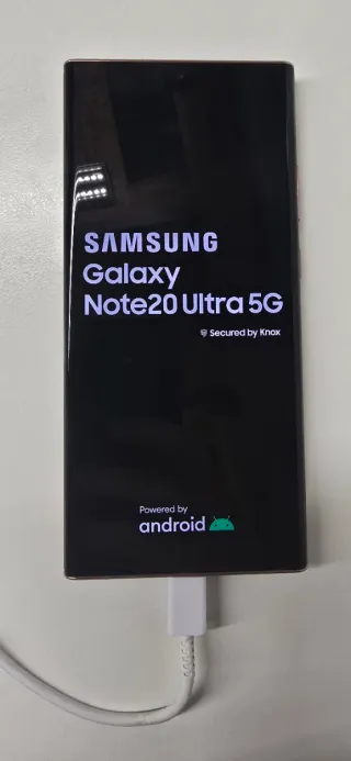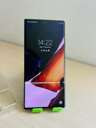 Teléfono móvil Samsung Galaxy Note 20 Ultra 5G con 256GB de almacenamiento. - Pantalla grande y vibrante. - Cámara versátil para fotos y vídeos. - Conectividad 5G para alta velocidad. - Tiene dos rallas verdes en la pantalla, así como alguna manchita por los bordes y una esquina desconchada, pero funciona perfecto. - En su caja, sin cable ni cargador.