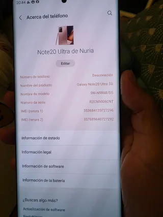 Samsung galaxy note 20 ultra 5g de 256gb. Tiene la pantalla rota y la señal de antena va y viene. La bateria fue cambiada hace un mes en el servicio tecnico por una bateria original de dicho telefono el valor de la reparacion fueron 100 €. Se entrega con carcasa morada y en su caja original