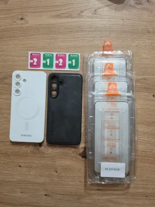 Pack de accesorios para Samsung Galaxy S25+. - Funda protectora blanca con MagSafe. - Funda protectora negra tipo piel. - Tres protectores de pantalla.