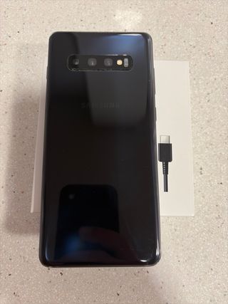 Teléfono móvil Samsung Galaxy S10 con 128GB de almacenamiento y 8GB de RAM. Incluye cable USB-C a USB-C y caja original. - Capacidad de almacenamiento: 128GB - Memoria RAM: 8GB - Incluye cable USB-C y adaptadores. El teléfono está restaurado y funciona perfectamente. - Tapa trasera cambiada. - Batería nueva.