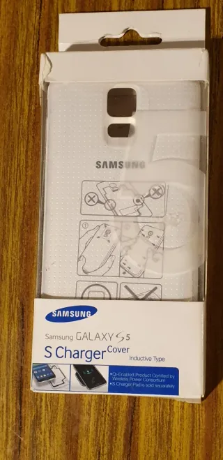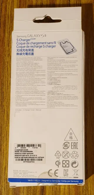 Tapa de carga inalámbrica para Samsung Galaxy S5. La caja de carton esta deteriorada pero el articulo esta nuevo - Modelo: EP-CGB00/WEDWW. - Fabricado en Vietnam. - Color blanco