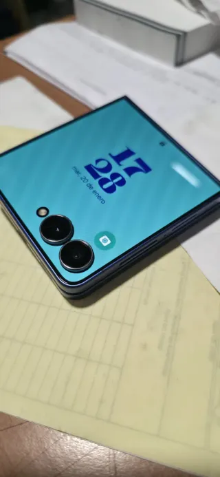 Teléfono móvil Samsung Galaxy Z Flip 7 en color azul. Usado solo durante dos meses, en perfectas condiciones. Se vende porque no termino de hacerme a Android. Se otorga caja y factura de compra - Capacidad de almacenamiento de 512 GB.