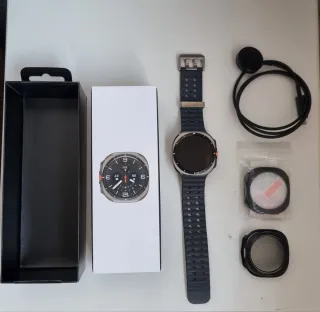 Reloj inteligente Samsung Galaxy Watch Ultra. Regalo 2 protectores de plástico con protector de pantalla. - Diseño moderno con correa de silicona. - Bisel plateado. - Incluye cargador magnético.