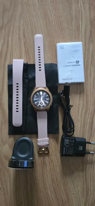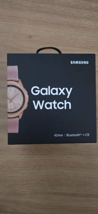 Reloj inteligente Samsung Galaxy Watch en color oro y rosa. Modelo de 42mm con conectividad Bluetooth y LTE. - Diseño elegante y moderno. - Correa de silicona en color rosa. - Esfera analógica con detalles dorados. Usado muy poco, siempre con protector y con otra correa que incluyo en la caja. La original está sin utilizar y además trae otra correa de diferente tamaño.