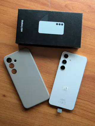 Teléfono móvil Samsung Galaxy S24 con acabado plateado y 256GB de almacenamiento. Solo 2 semanas de uso. - Diseño elegante y moderno. - Incluye caja original y funda protectora.