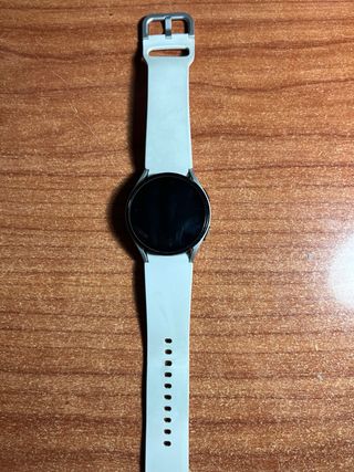 Samsung Galaxy Watch 4 40mm (Bluetooth, GPS) en color blanco/plata con correa gris original. Incluye cargador inalámbrico original Samsung. Tiene Wear OS, monitor de salud (ritmo cardíaco, oxígeno en sangre, sueño, +40 deportes), resistente al agua 5ATM.