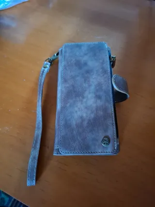 Funda tipo cartera para Samsung Galaxy A34 con acabado en piel sintética marrón y detalle de costuras. - Cierre con botón a presión. - Incluye correa de mano. - Compartimentos interiores para tarjetas.