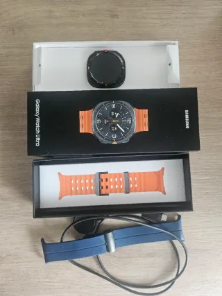 Reloj inteligente Samsung Galaxy Watch Ultra 2 en color negro y naranja. Incluye correa adicional. - Correa de silicona azul. - Cargador inalámbrico. - Correa metalica