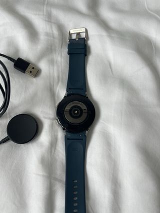Reloj inteligente Samsung Galaxy Watch4 Classic con correa azul marino y detalles plateados. Incluye cargador. - Diseño elegante y moderno. - Correa de goma pero efecto cuero. - Bisel giratorio. - 46mm - Usado 2 veces.