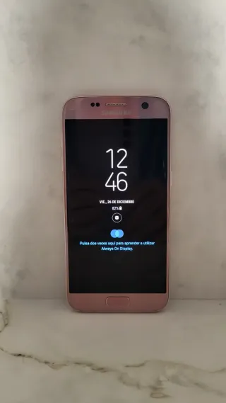 Teléfono móvil Samsung Galaxy S7 en color rosa. - Pantalla de 5.1 pulgadas. - Cámara de 12 MP. - Incluye auriculares y conversor USB. - Incluye funda protección. - Incluye caja e instrucciones.
