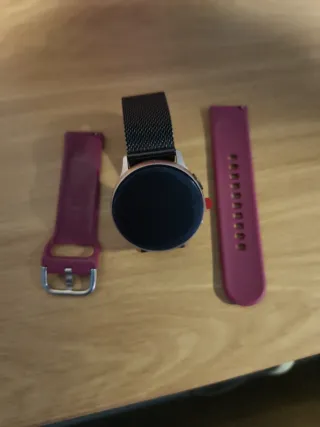 Reloj inteligente Samsung Galaxy Watch Active 2 con correas intercambiables. - Correa de malla metálica negra. - Correa de silicona rosa. - Correa de silicona burdeos.