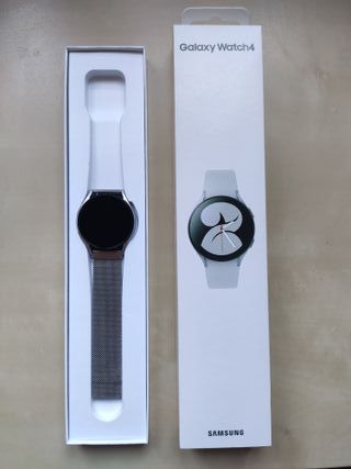 El cable está ligeramente dañado (ver foto). La batería dura entre 1 y 1,5 días. Reloj inteligente Samsung Galaxy Watch 4 con conectividad WiFi. Diseño elegante en color plata. - Caja de aluminio. - Correa de malla milanesa. - Pantalla circular. - Cierre magnético.