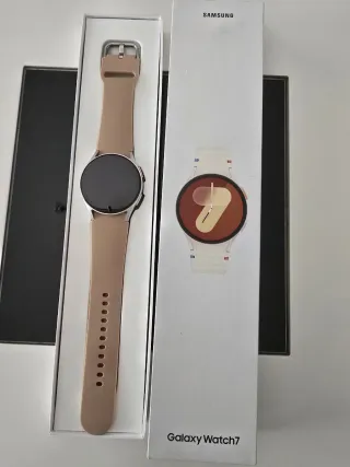 Reloj inteligente Samsung Galaxy Watch 7 de 40 mm en color beige. -32gb de memoria y 2gb de ram - Correa de silicona suave. - Bisel metálico. - Si golpes ni rayones. - se entregan con caja, cargador original y 4 correas. 3 de ellas sin estrenar. - comprado el 27/02/25. Incluyo ticket de compra del corte inglés por lo que tiene 2 años más de garantía.