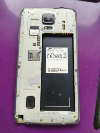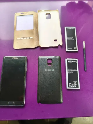 Teléfono Samsung Galaxy Note 4 en color negro, junto con varios accesorios. No enciende incluye funda y 2 baterías originales - Funda tipo libro. - Tapa trasera. - Dos baterías. - Lápiz Stylus.