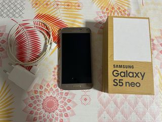 Teléfono móvil Samsung Galaxy S5 Neo en color dorado. -Incluye: cargador, cable, cascos y funda roja. Además de su caja original. - Modelo: Galaxy S5 neo - Color: Dorado - Pantalla de 5.1″ Super AMOLED, cámara trasera de 16 MP y memoria interna de 16 GB (ampliable). - La batería tiene un 62 % de carga, y el móvil está listo para usar.