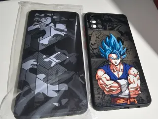 Dos fundas para Samsung Galaxy A51. - Una funda con diseño de camuflaje en tonos grises y negro nueva a estrenar. - Otra funda con diseño de personaje de anime (Goku Super Saiyan Blue) sobre fondo de cómic en perfectas condiciones. -2 cristales templados nuevos a estrenar.