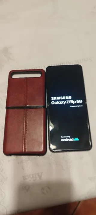 Teléfono móvil Samsung Galaxy Z Flip 5G con funda roja de regalo - Color del teléfono: negro. - Color de la funda: marrón. - Sin marcas,ni golpes - En su caja original NOTA: A veces pierde la conectividad pero luego la recupera